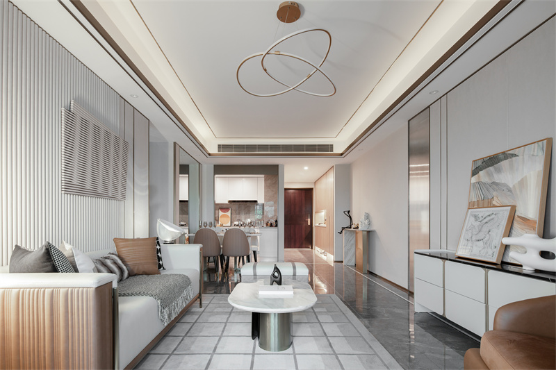 不遠處的藝術樓梯,讓另一側的景觀不再單調。玻璃、金屬扶手,高級冷艷,白色大理石踏步、金屬包邊,陽光與燈光交相輝映,在樓梯上描摹出水的波紋,讓通往二層的樣板區空間更具儀式感。