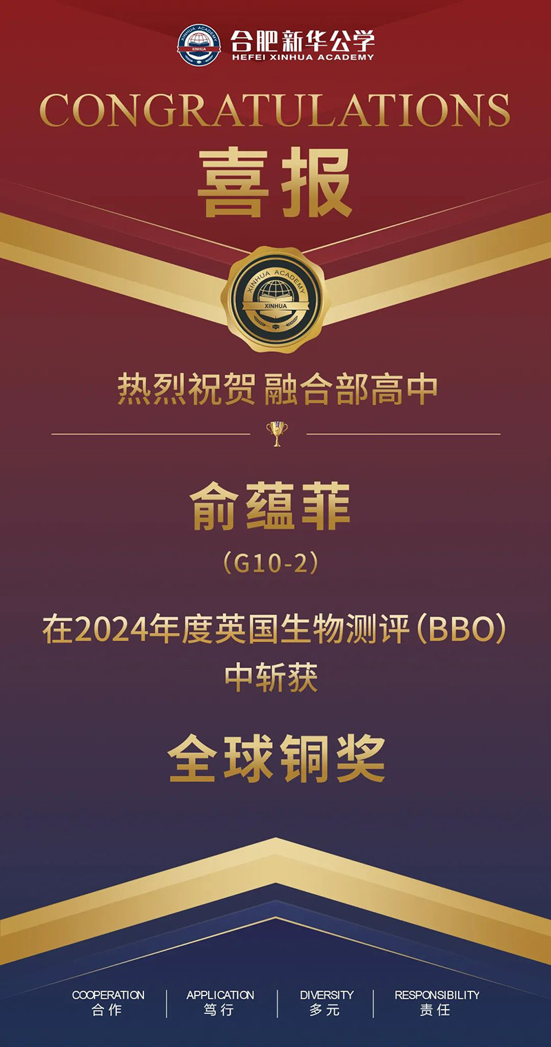 恭喜我校融合高中部G10-2的俞蘊菲同學,在2024年度英國生物測評(BBO)中獲得全球銅獎的好成績。
