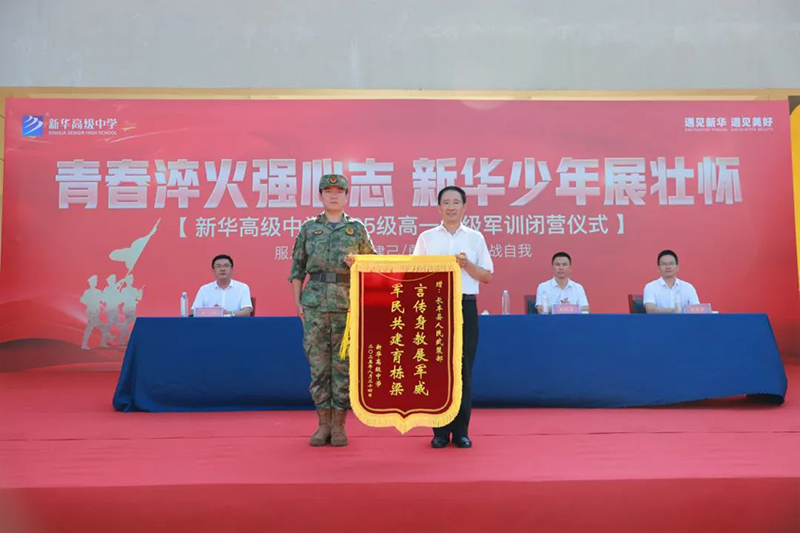新華高級(jí)中學(xué)校長徐邦民向長豐縣人武部贈(zèng)送了錦旗,表達(dá)學(xué)校對(duì)全體教官辛勤帶訓(xùn)、嚴(yán)謹(jǐn)教導(dǎo)的衷心感謝。
