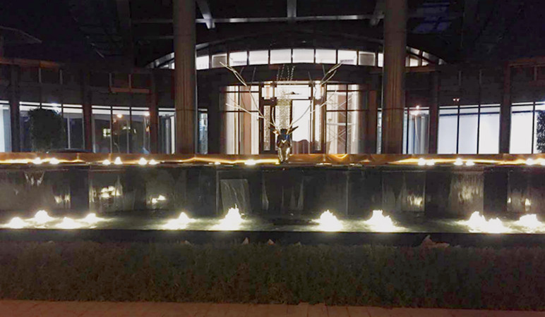 入戶處,緩緩流動的水池如娟娟細流、栩栩如生的雕塑如麋鹿漫步、青蔥翠綠的灌木如山間野花,閉上眼,仿佛踏入了原始森林,神秘而寧靜。