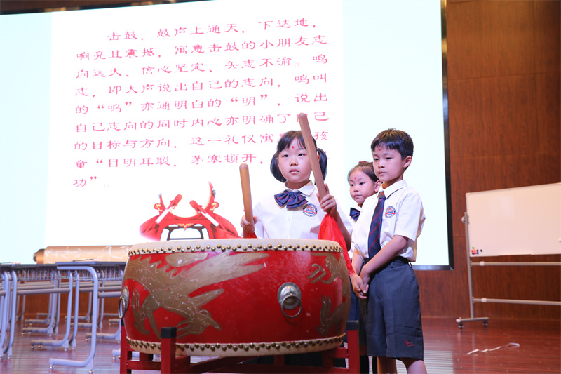 擊鼓三聲,以示從今啟蒙,以立志向。一通鼓:學(xué)子如斯,高山景行;二通鼓:五育并舉,六藝均衡;三通鼓:開筆啟智,慧悅?cè)松?/font>