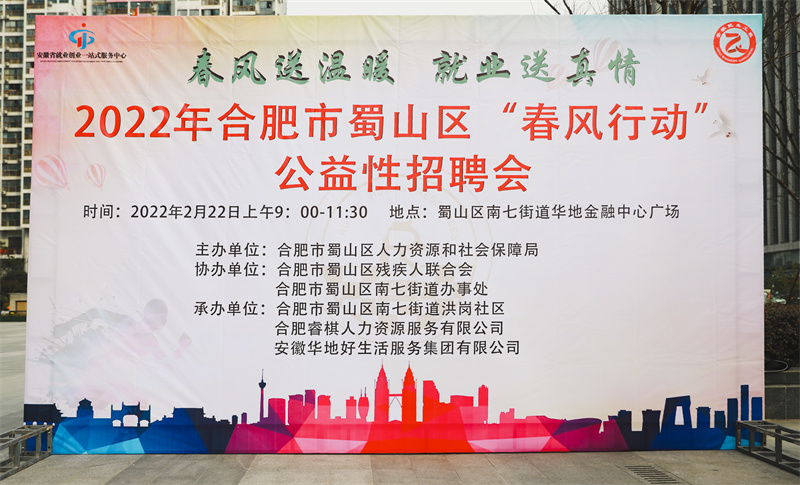春風(fēng)送溫暖,就業(yè)送真情。2月22日,由合肥市蜀山區(qū)人力資源和社會保障局主辦、合肥市蜀山區(qū)殘疾人聯(lián)合會、南七街道辦事處協(xié)辦、華地好生活集團(tuán)承辦的2022年蜀山區(qū)“春風(fēng)行動”公益性招聘會在華地金融中心廣場盛大舉辦。