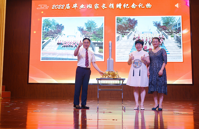 家委會代表上臺贈送畢業禮物,有著黃金版心靈的孺子牛就像老師辛勤耕耘,托起上面的火箭(孩子),讓他們飛翔,同時“火箭”也包含了家長們對新華公學的美好祝愿:越來越好,牛氣沖天。