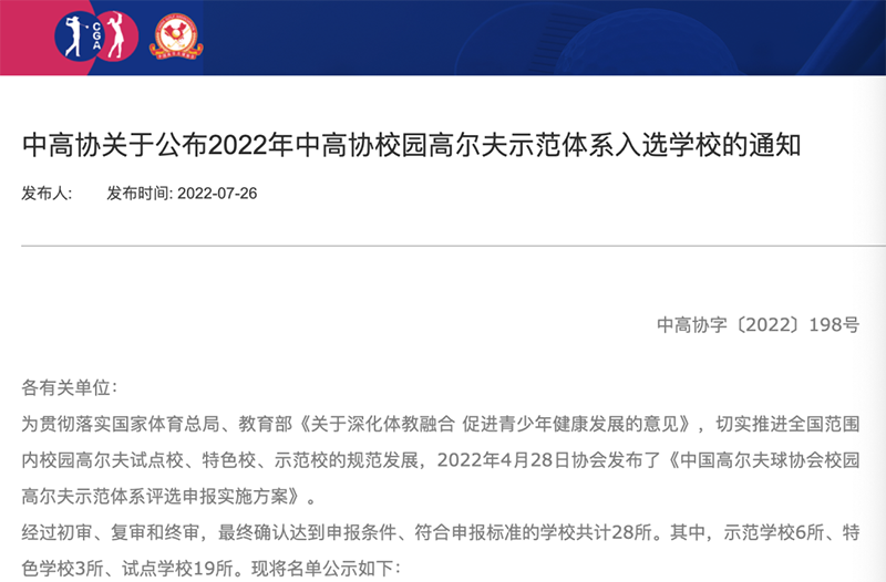 據(jù)中國高爾夫球協(xié)會2022年7月26日在官網(wǎng)公布的中高協(xié)字〔2022〕198號文件所示:合肥新華公學(xué)成為2022年全國“校園高爾夫”試點(diǎn)學(xué)校,同時也是安徽唯一一所試點(diǎn)學(xué)校。